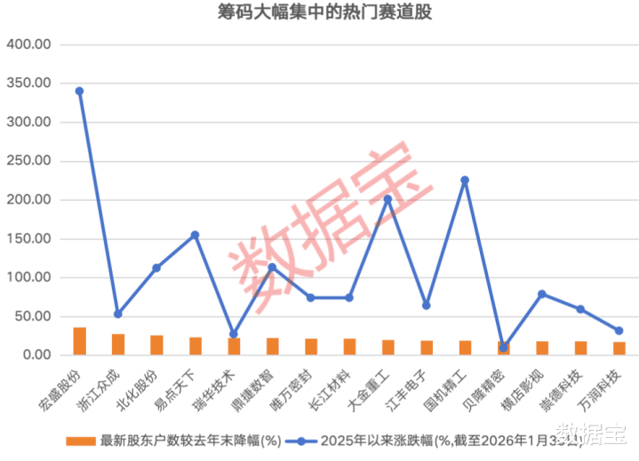 据证券时报·数据宝统计,以国防军工、基础化工、电力设备等为主的热门主线股中,截至2026年1月30日,最新股东户数较去年末(2025年12月31日)下降幅度不低于5%的个股有116只。